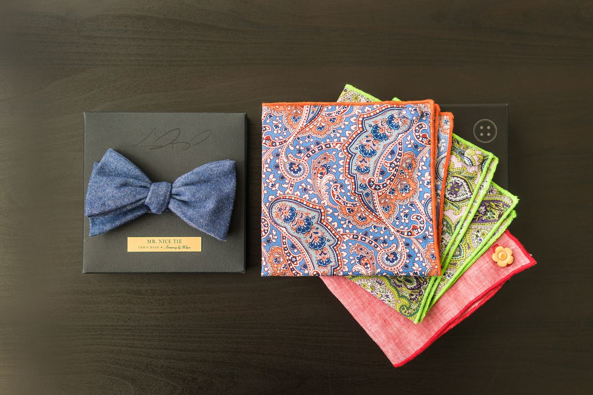 The great thing about our pocket square is that it comes in a specially designed box with our slogan “It’s okay to be a square.” We wanted the packaging to make an impression. As we started doing more and more weddings, grooms were giving the pocket square to their groomsmen as gifts. It’s the perfect gesture of appreciation because your friends are presented with this really nice box that has a sliding drawer. Inside is this stylish pocket square, which can also be monogrammed. And since a lot of men rent their tuxedos, the pocket square is the one thing they can keep and remember the day when they stood by their best buddy.