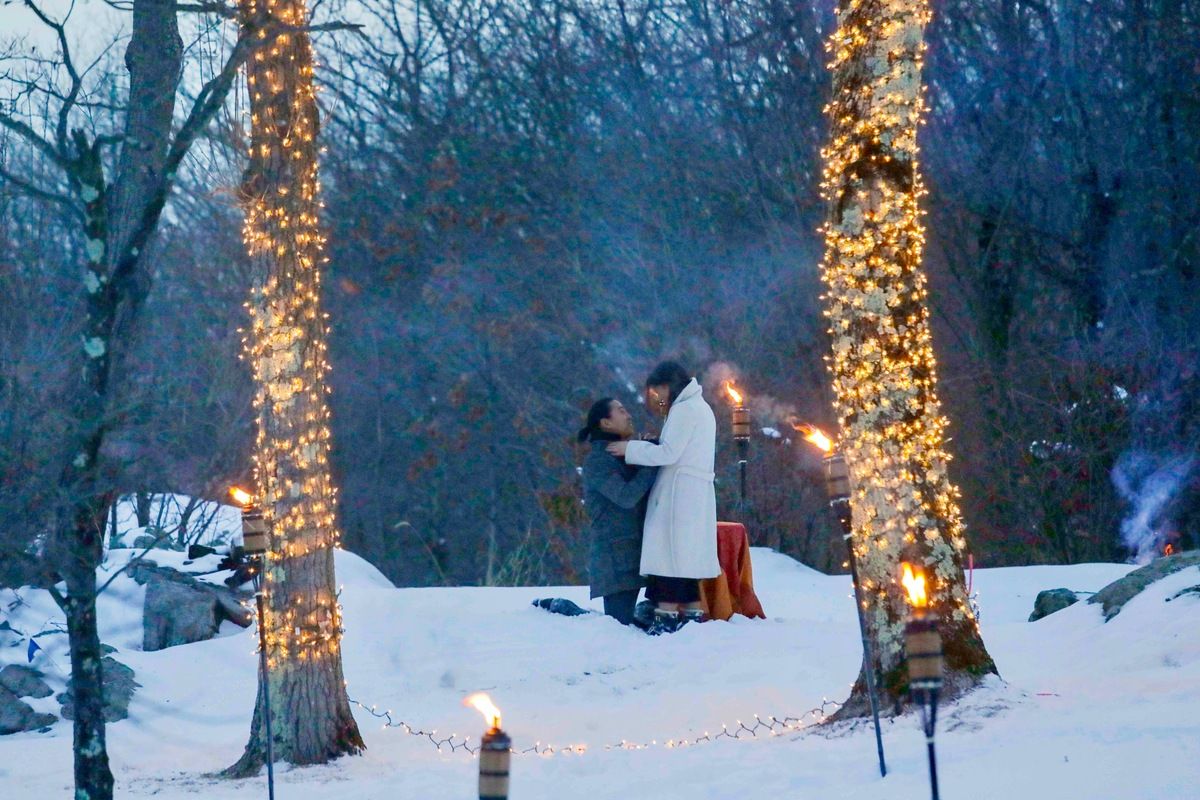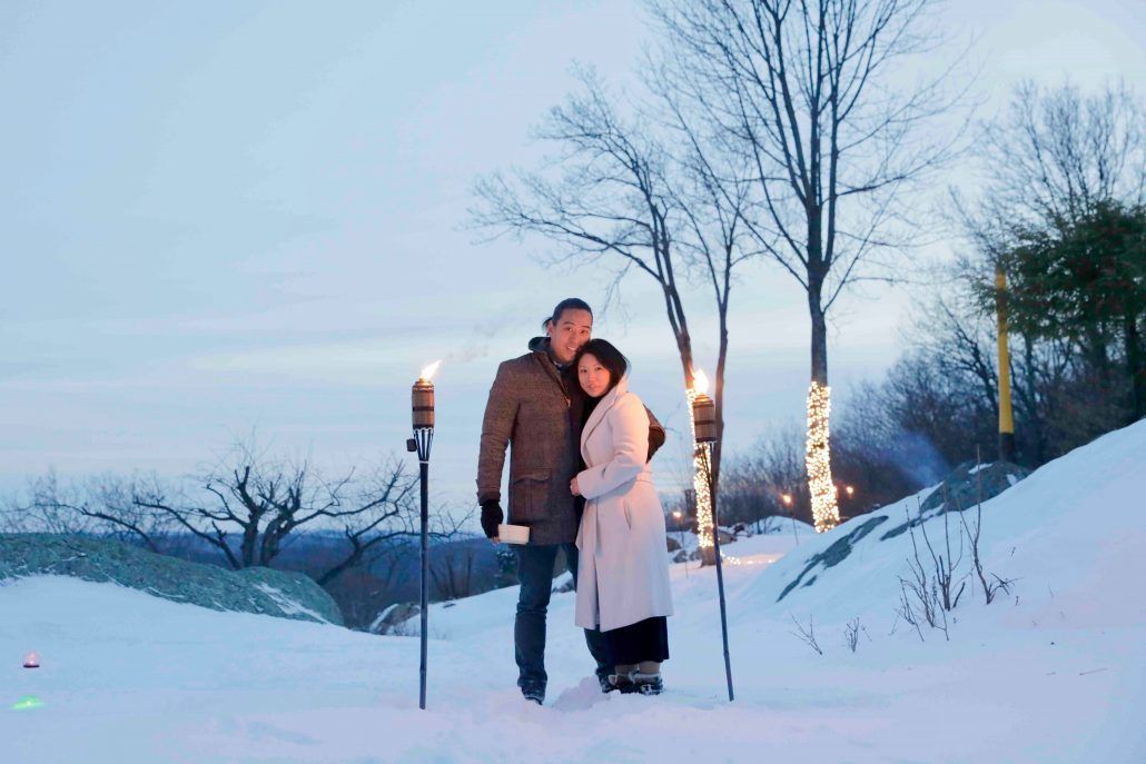 While most wouldn’t describe Bryan as the romantic type, Jean brought out his softer side. And when it came time to propose, Bryan pulled out all the stops. He took her to his parents’ country house in Garrison, NY for a winter weekend getaway. Bryan led Jean down a pathway illuminated by tiki torches and holiday lights, which led to an outdoor table arrangement. The twinkly snow covered scene couldn’t have been more perfect. When Jean discovered on the table a small box with a ring, Bryan got down on one knee and asked her to marry him.