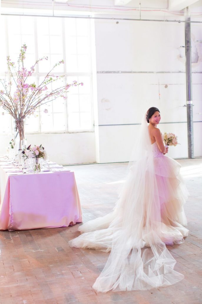 With only four months to plan, the couple faced many challenges in transforming a bare, hollowed out space into their wedding vision. “Bryan had a lot on his plate just getting the space even legally event-ready. The venue is massive and we had to move around wherever construction was at that time. There was a lot of going back to the drawing board,” Jean recalls. Event planner Medium Rare and production team Oxygen Eventworks helped the couple map out and light the space.