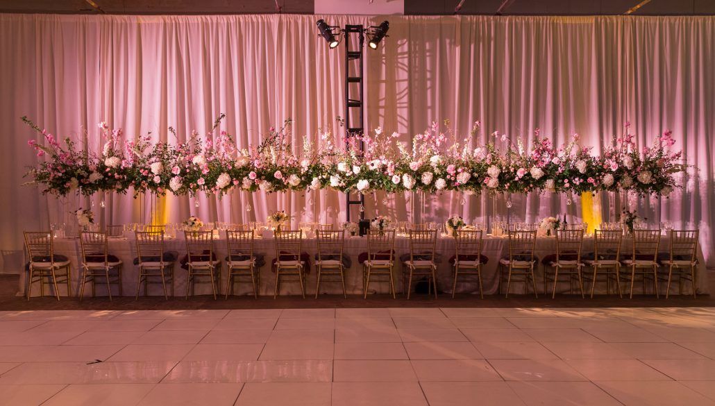 As everyone entered the reception area, an atmospheric evening light had just started filtering through the venue to beautiful effect. Jean and Bryan along with thirty guests took their seats at the head table where they were welcomed by a magnificent floral display evoking a mood of enchanted romance. A gorgeous mix curly willow, blush cherry blossoms, white hydrangeas, roses, snapdragons, delphiniums, burgundy scabiosas, brunia berries, and greenery were arranged on tall metal stands. Accented by teardrop-shaped glass bubbled, the blooms gave the impression of a floral chandelier hanging above the tablescape. Complementing petite floral arrangements brought an intimate feel to the dining space.