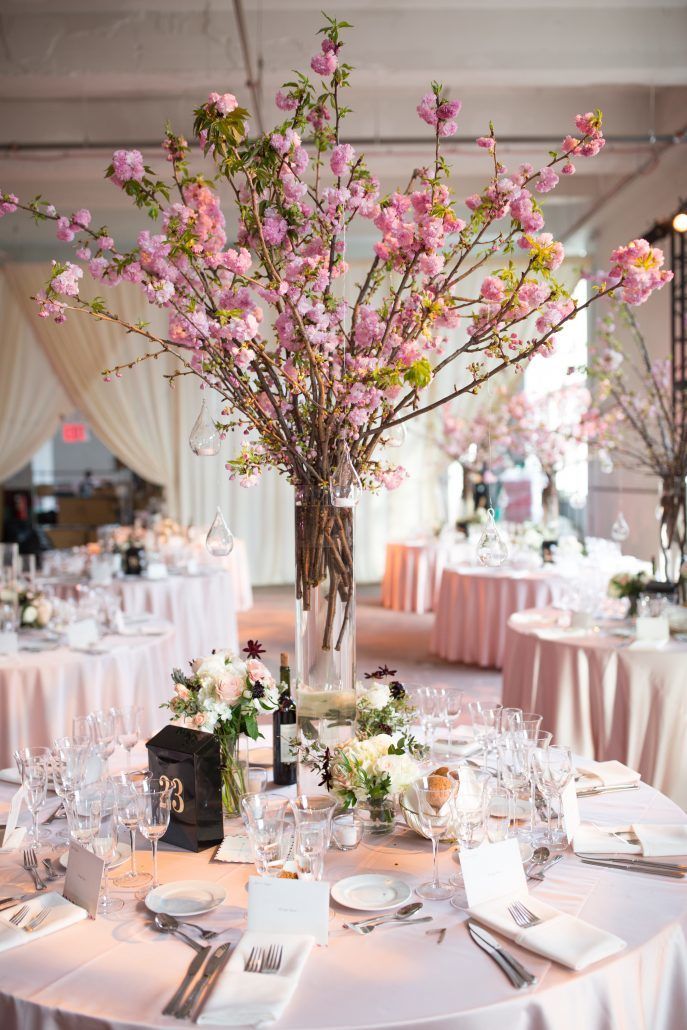 Reception décor featured an array of various centerpieces in shades of blush, white, and burgundy. Some tables were adorned with high centerpieces featuring a spray of light pink cherry blossoms accented with glass teardrop votive holders. A lovely trio of cluster arrangements brought charm and whimsy to the display. The second style featured a low centerpiece of lush blooms illuminated by the soft glow of ivory floating candles set in elegant cylinder vases.