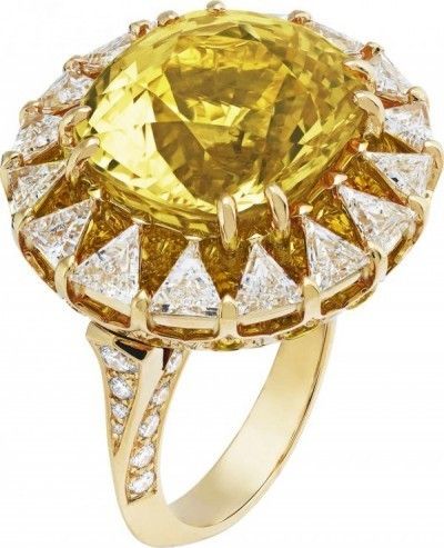 From Van Cleef & Arpels’ new Peau d’Âne collection, the exquisite Solar Ring is crafted in yellow gold, and features a 16ct cushion-cut yellow sapphire, surrounded by smaller sapphires and diamonds.