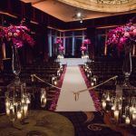 Joann carried a one-of-a-kind bouquet of eggplant calla lilies, plum ranunculus, purple and fuchsia roses, and burgundy anemones. Tall arrangements in similar tones with raspberry spray roses and purple hydrangeas stood at the aisle entrance and the altar with votive candles clustered at the base, creating a mesmerizing, romantic ceremony.
