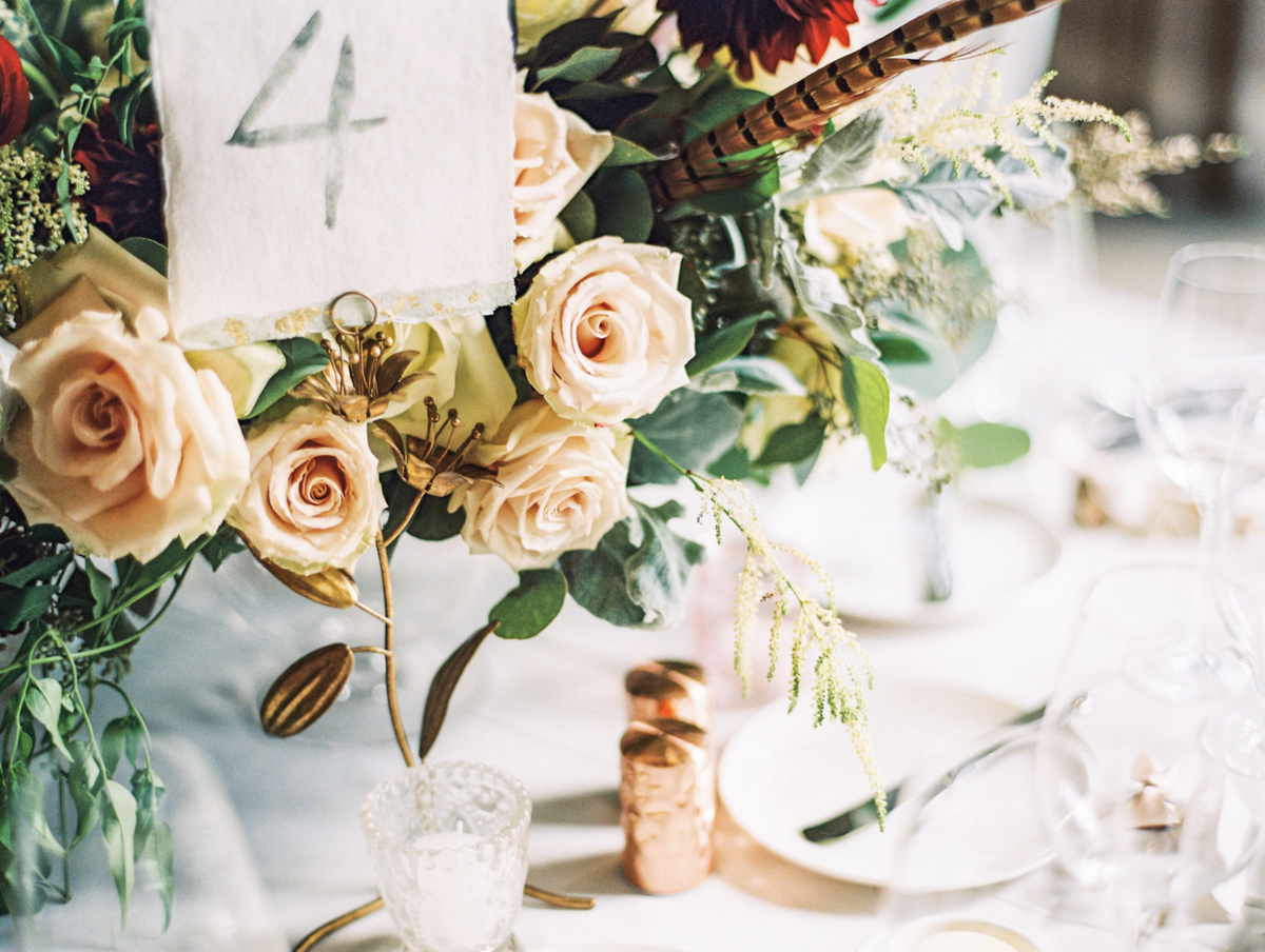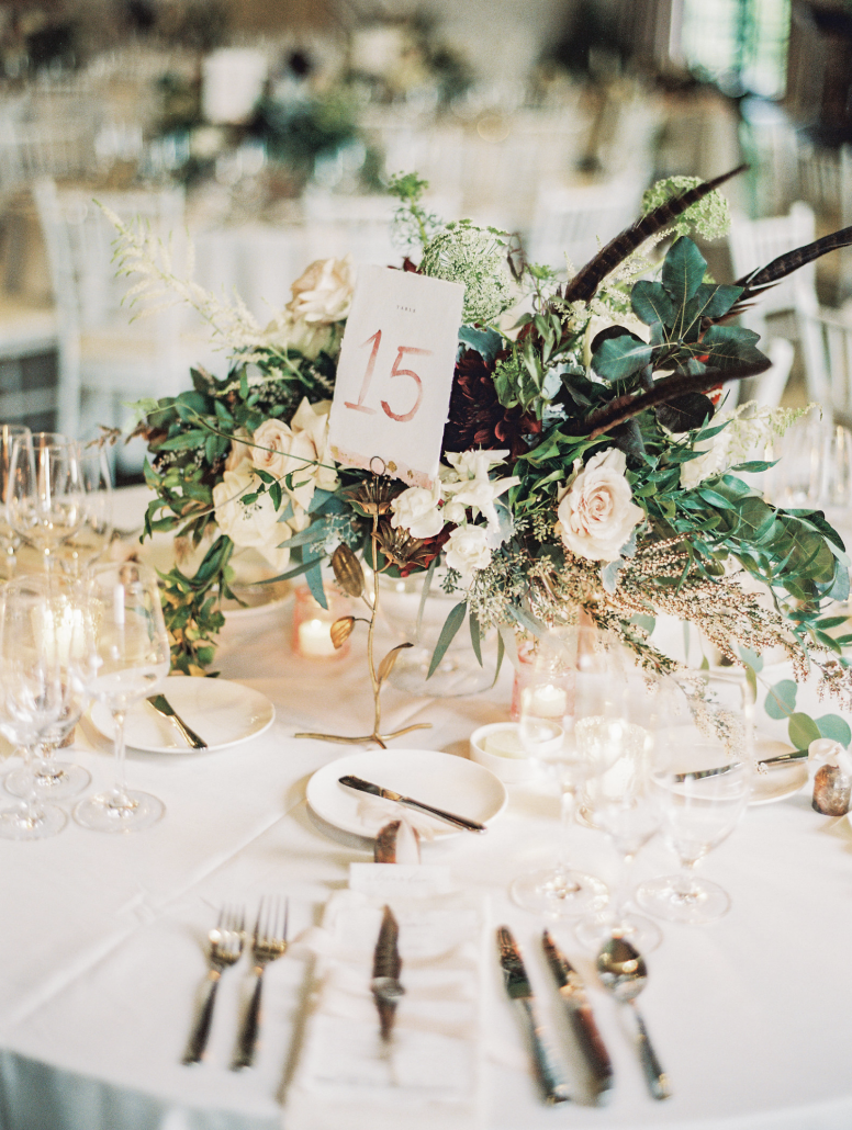 Tables were decorated with lush, natural centerpieces featuring roses, ranunculus, dahlias, hellebore, heather, veronica, jasmine, and astilbe in shades of burgundy, blush, and white. Greenery elements included eucalyptus, dusty miller, and ruscus. The couple expressed their deep connection to nature by accenting the arrangements with pheasant feathers. “Chase loves to hunt and I love being outdoors. The feathers put a unique, personal touch on the floral décor,” Kate said. Clear and vintage rose votives illuminated the display, adding a warm and intimate ambiance to the tablescape.