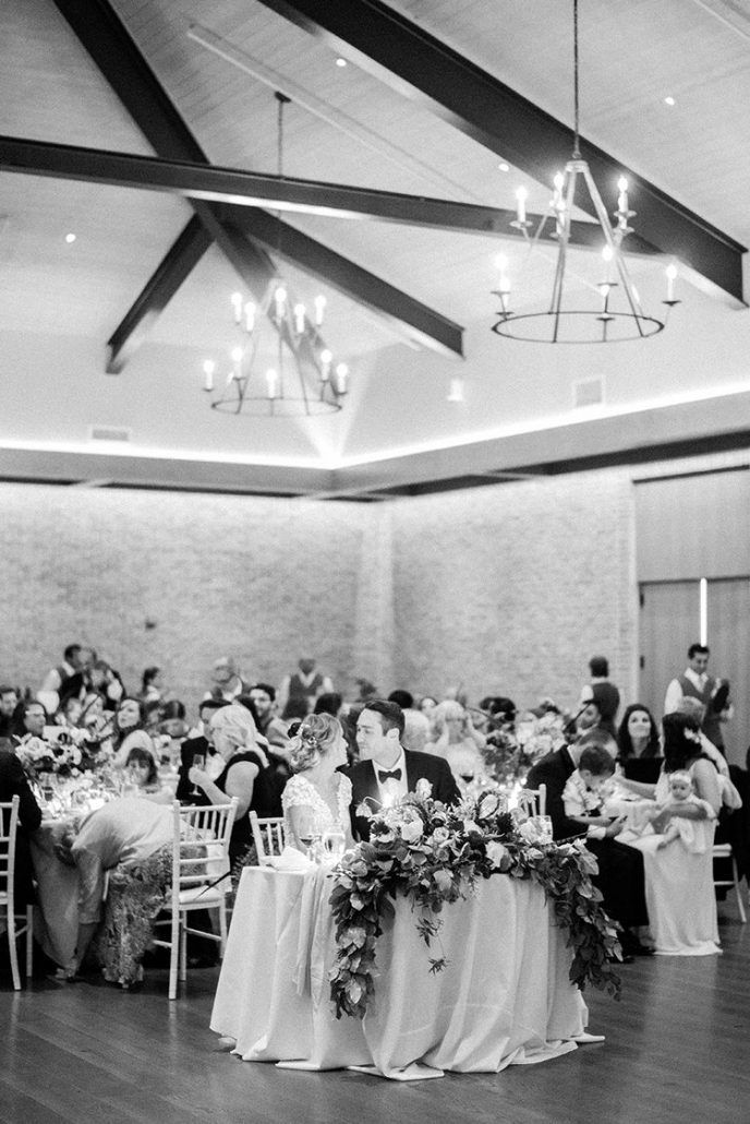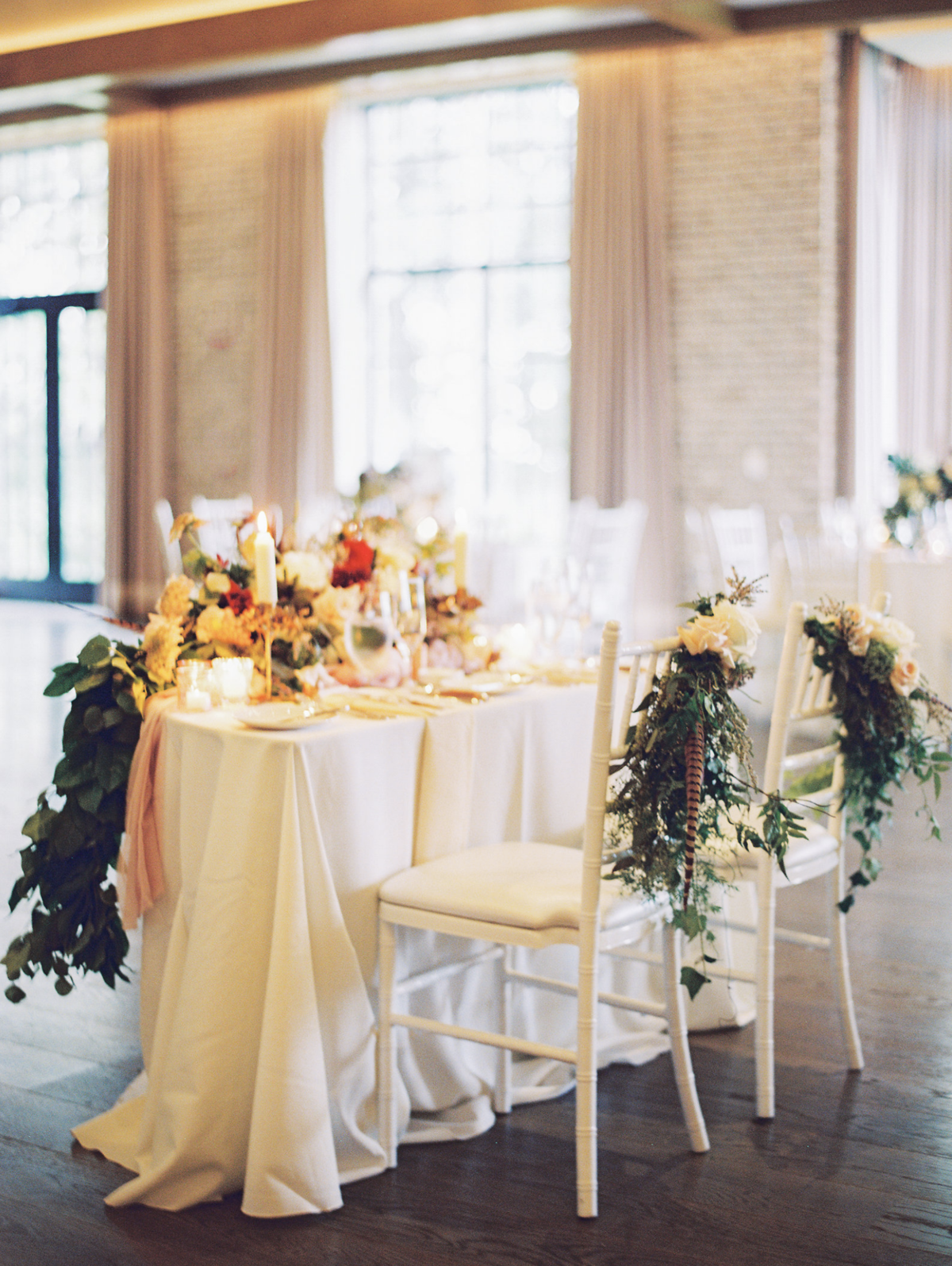 As guests took their seats, Kate and Chase took their place at the sweetheart table. Their fairytale romance was honored with a breathtaking candlelit setting of eucalyptus garland embellished with gorgeous blooms. The couple’s chairs were decorated with lovely greenery and flower accents. “Everyone complimented on the décor and said the flowers were the most beautiful they had ever seen,” recalls the bride.