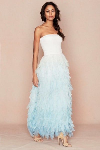 Exciting news for boho brides planning beach weddings: Luxe resort-wear brand Calypso St Barth has just launched a bridal collection, including wedding dresses, accessories and underpinnings. Our favorite is this pale blue, ombré gown.