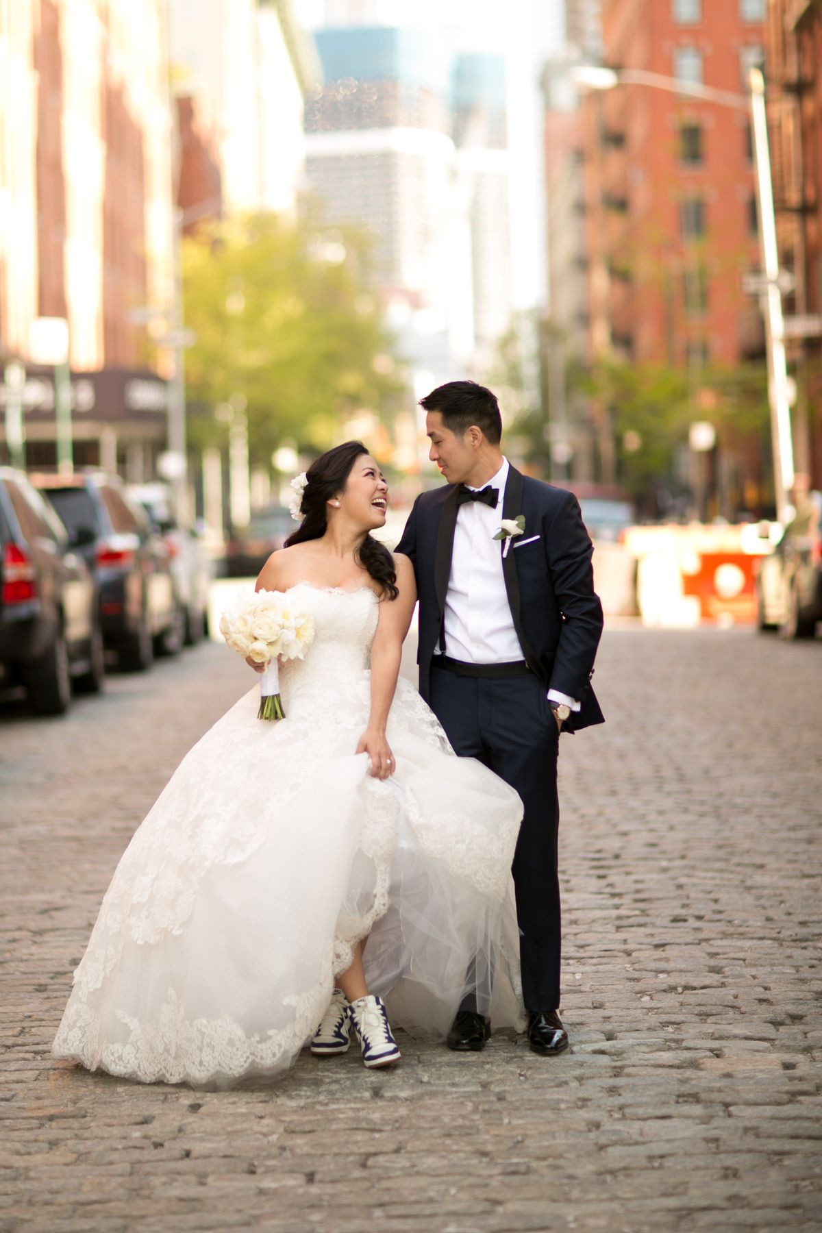 Comfort over style, or style over comfort? Sporting her Nike high tops, bride Justine makes a case for both sides at her Tribeca Rooftop wedding.