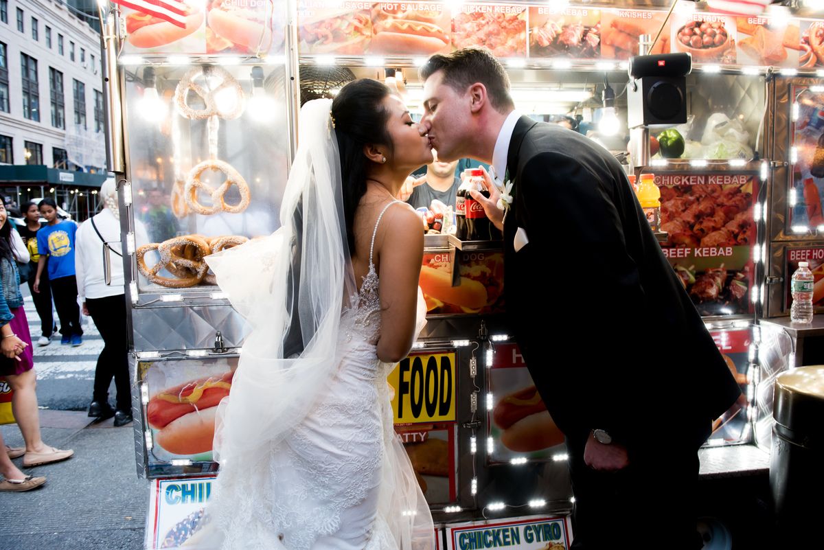 The sign of a true New York couple? When you stop to take a wedding photo in front of one of the city’s iconic food trucks!
