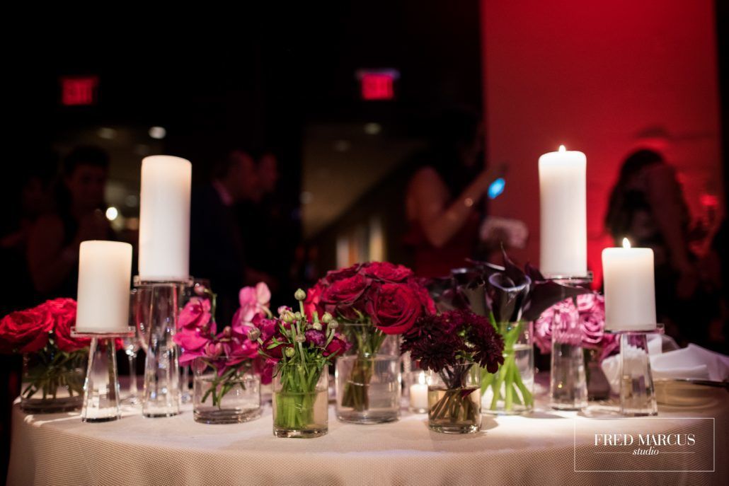 After Marianna & Peter’s ceremony, guests were greeted wth a card table that expressed Marianna’s taste for simple elegance with a contemporary twist. The gorgeous display presented round clusters of deep red freedom, Baccara roses, and burgundy dahlias placed at an angle in tall cylinder glass vases. The light of pillar and votive candles showed off the blooms’ exquisite detail and colors to beautiful effect.