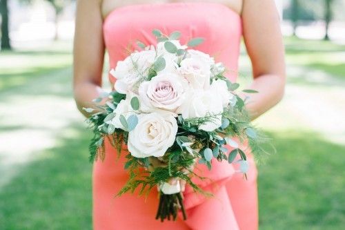 To make matters more difficult, I had decided that I wanted my four bridesmaids to each choose her own dress, with no color requirement, and at this point I had no idea what they would eventually choose. So that offered Rachel and Elianna no color help. They came up with the idea of lots of ivory, which I liked, and then finally I threw them a bone when I told them that my favorite color was purple. So we came up with a color scheme: green, ivory, and lavender, with pops of violet. I trusted their expertise entirely with flower choice. They completely nailed my vision, in fact they far exceeded my imagination. I was inundated with compliments on my bouquet!”