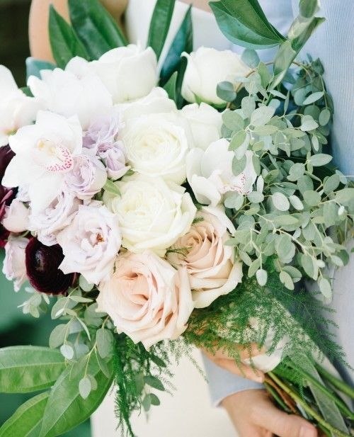 We created Alison’s bridal bouquet with roses, garden roses, ranunculus and a few perfect orchids, framed with greens including eucalyptus leaves and ferns. A bouquet should reflect the spirit and beauty of the woman carrying it on her wedding day. We love how the burgundy flowers draw the eye to Alison’s flattering lip color.