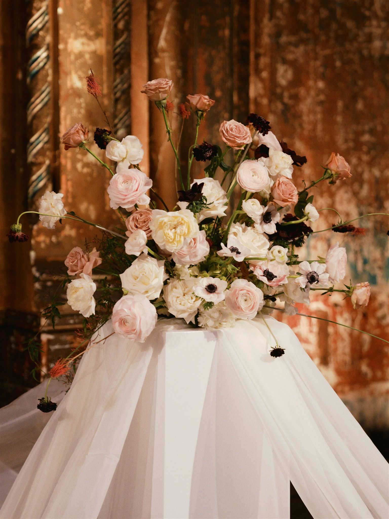 Are your earth tone florals falling flat? Try breaking up a subtle palette with a single, moody hue. For this ceremony backdrop at Angel Orensanz Foundation, burgundy anemones and scabiosa stood out against cappuccino, blush, and white blooms, adding depth, dimension, and a touch of drama to the overall display.
