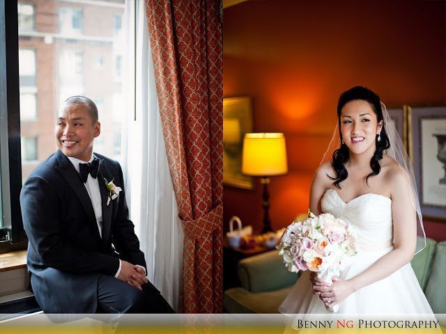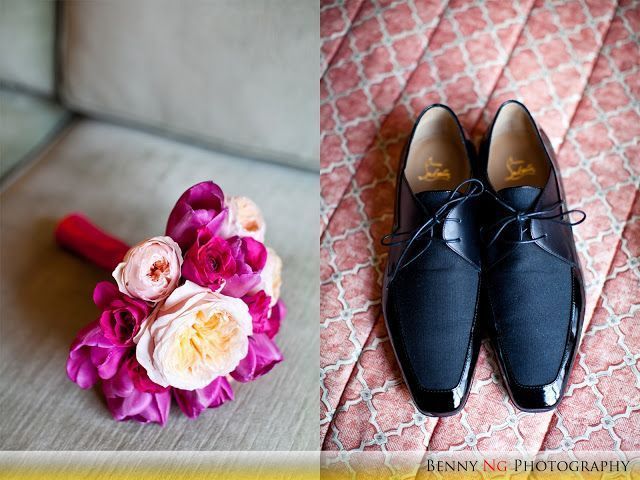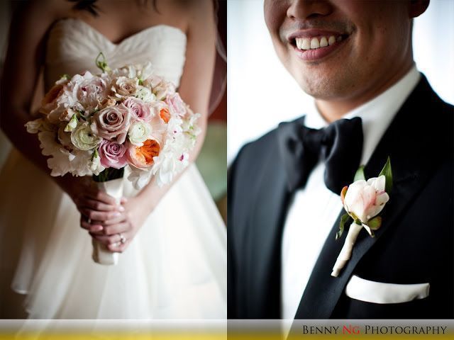 The bouquets featured coral peonies, and were central to the design. This beautiful flower has limited seasonal availability making it a very special choice. When coupled with the peach garden roses and white-toned flowers, the peonies really pop from these color complements. I was inspired by this couple’s sophisticated arrangement choice, and thought their look went perfectly with the awe-inspiring venue. So much health and happiness to Esther and James!