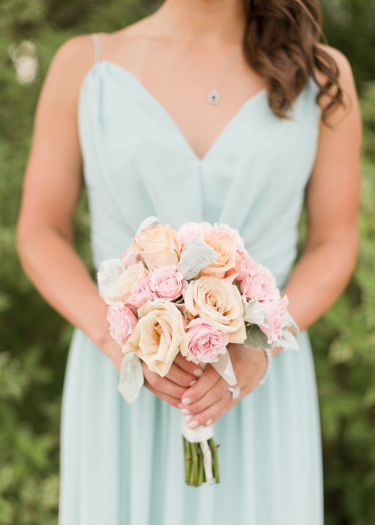 Posy: Essentially a smaller version of the round, the posy bouquet is a great choice if you want to keep things simple. Because of its size, this style is suitable for a petite bride and bridesmaids. A blend of pink and ivory roses radiates sweet romance. A combination of roses, peonies, and sweet peas looks lovely and vibrant. An all-white rose bouquet stuns against a regal blue bridesmaids gown.