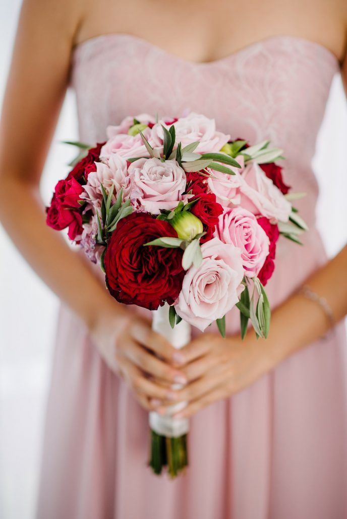 Nosegay: The nosegay bouquet has been around since medieval times when flowers were used to perfume the air from offensive smells. Very similar to the posy, it is a smaller bouquet featuring a compact cluster of flowers that is usually carried by members of the bridal party. A coral and pink myriad of roses, peonies, ranunculus with verdant greenery is a dazzling spectacle for the eye. Soft pink and peach roses complemented by dusty miller looks like a garden daydream. For a charmingly romantic look, arrange red and pink roses with accents of olive leaf.