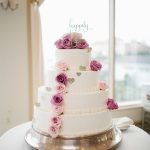 This wedding takes a charming, yet sophisticated approach to the heart motif. Clusters of purple and soft pink roses decorate each tier alongside glistening gold hearts that culminate in a statement topper proclaiming “Happily Ever After.”
