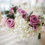 - Cheryl & Lovin Wedding – Hydrangea Purple Rose Majolica Seeded Euc Rose Low Centerpiece – Greentree Country Club – by Caroline Yoon Photography
