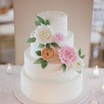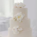 There’s nothing more timeless and beautiful than an all white wedding. White peonies and spray roses placed on each tier of this simple cake add style and texture, making the design an instant classic.
