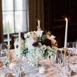 - Emily & Daring Wedding – Low Centerpiece – Dahlia Eucalyptus Hydrangea Lisianthus Garden Spray Rose Ruscus – Battello – Photography by Casey Fatchett