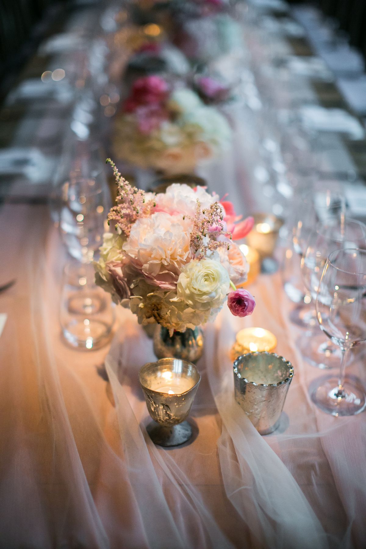 Lauren and Jordan Wedding – Low Centerpieces for Head Table Astilbe Parv Euc Peony Ranunculus Garden Quicksand Menta Rose Stock – Blue Hill at Stone Barns NY – Photography by Craig Paulson