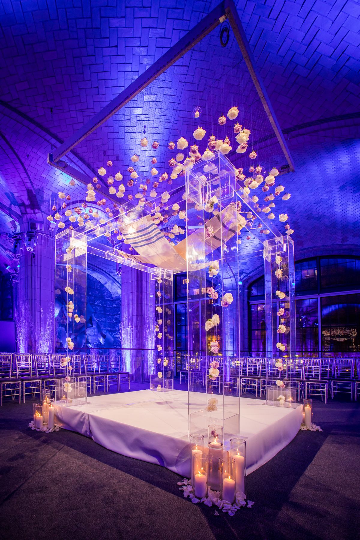 In Jewish weddomg ceremonies, the bride and groom are married under a chuppah, a four-post canopy-like structure with a covering that represents the home they will build together. Today, couples use it to not only express their Jewish faith, but to put a personal and decorative touch on their ceremony. We’ve had the pleasure of collaborating with brides to create the most breathtaking chuppahs with designs ranging from wisteria branches adorned with lush florals and greenery to airy, lucite structures that appear to be floating.