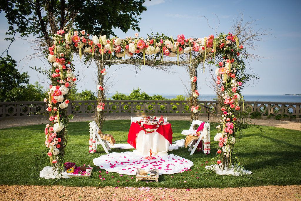 The mandap is a four-post structure with a cover that creates the sacred space for Hindu wedding ceremonies. It encloses royal chairs for the bride and groom, a holy fire, and sacred objects and offerings. A Hindu priest guides the couple in performing a series of rituals that seal their bond for life. We’ve had the opportunity to work with brides in planning the décor for their Hindu ceremony and similar to the chuppah, the mandap reflects their personality and unique style.