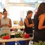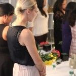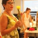 Expert floral stylist, Dawn, led the demonstration (in an adorable yellow dress!), while students got hands-on experience preparing and working with flowers. Contemporary table centerpieces tend feature strong lines, unusual flowers or greenery and unexpected texture. Here you’ll notice a geometric look, created with a square base and diagonal greens. These modern floral arrangements are very different in style from the softer, romantic florals featured in classes like Roses & Rose.
