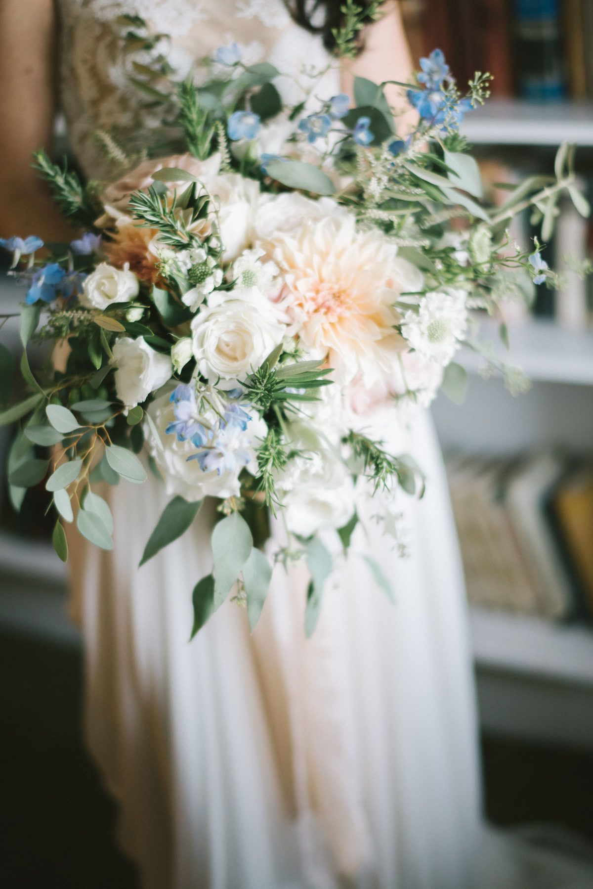 Make your bridal bouquet stand out by accenting soft, lush blooms and greenery with subtle blue florals such as delphinium.