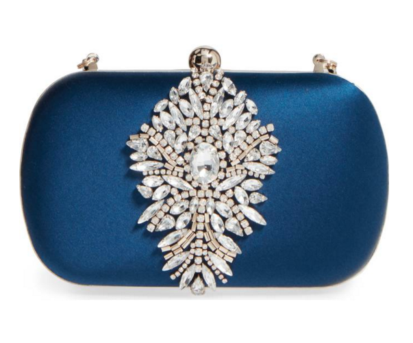 Store your wedding day essentials in a dazzling jewel encrusted blue satin clutch from Badgley Mischka.