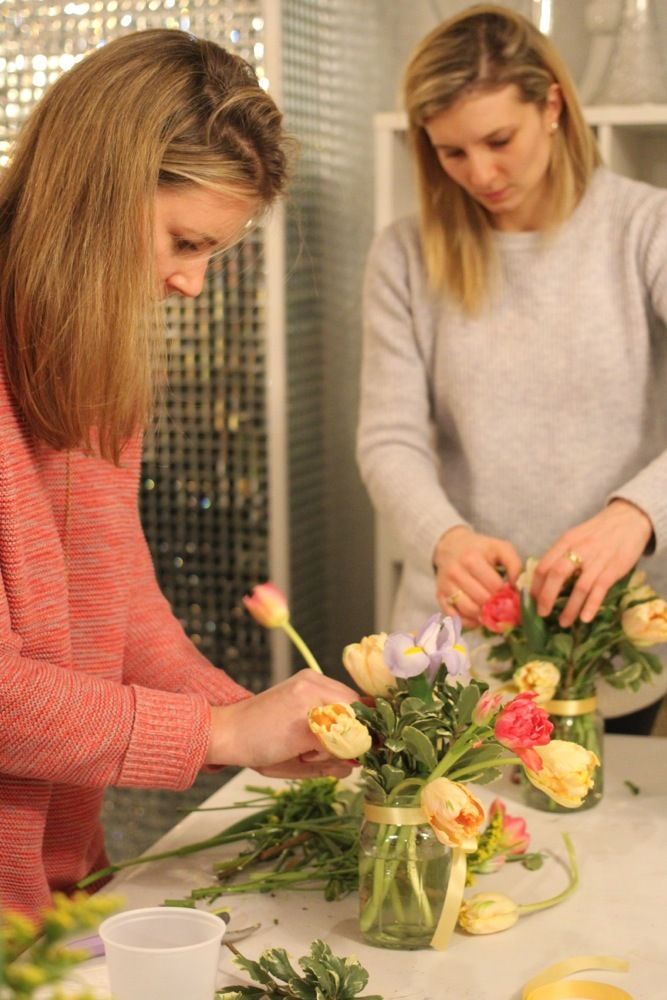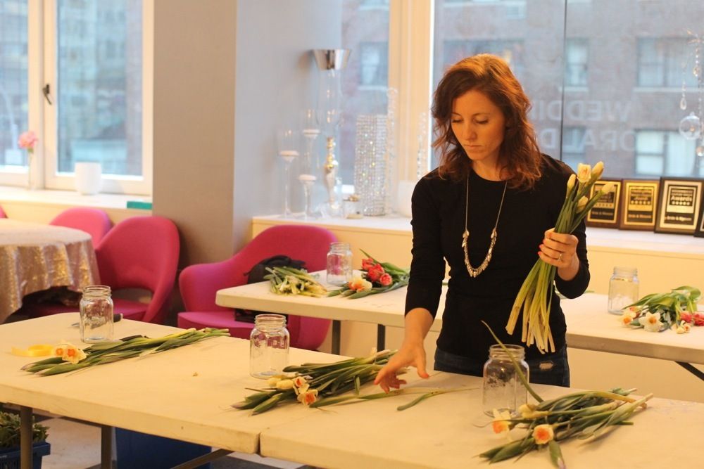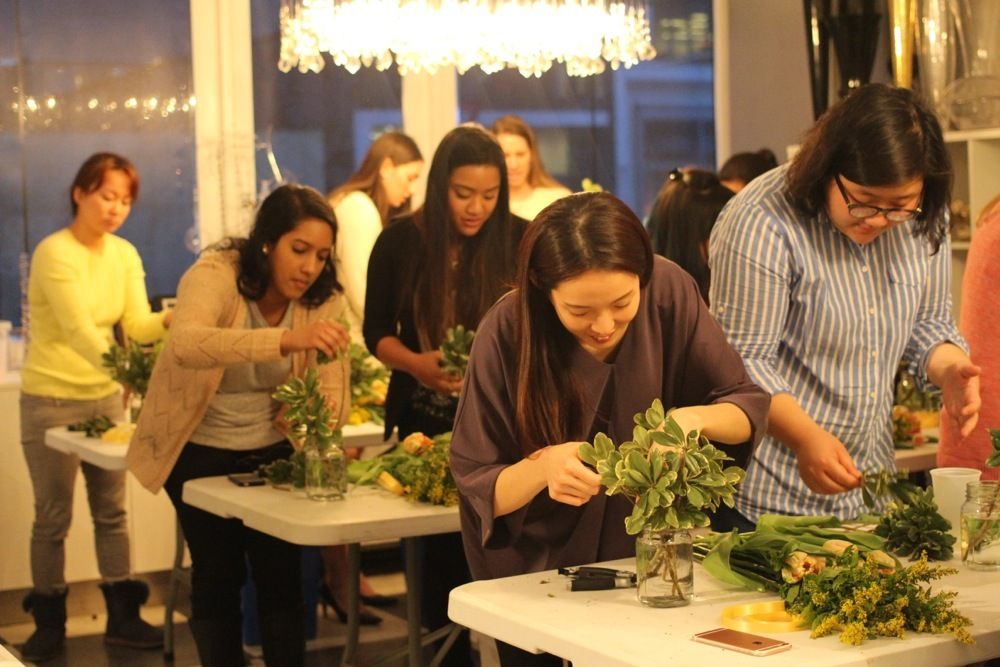 The most recent flower class at the Bride & Blossom showroom on the Upper East Side was one of our most successful yet — we are always so happy to see the beautiful creations made by our students at the end of the night! The spring fling theme carried through their designs in the form of bright tulips, lush greenery and delicate pastel accents.
