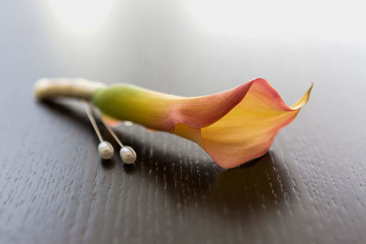 Thanks to its distinct character, the calla lily is one of our favorite flowers to use as the feature floral in boutonnieres. A coral hued calla lily adds a vibrant pop of color to your groom’s wedding day attire. For a natural look, pair a single white bloom with a few sprigs of greenery.