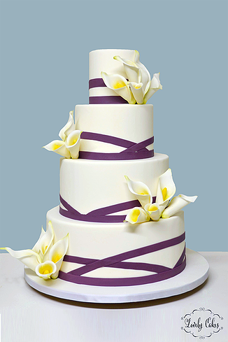 Use the floral motif as inspiration for your wedding cake design. Delicate, sugar spun calla lilies look ever-so-pretty on an all white cake. A 4-tier stunner combining the blooms with a luxe purple ribbon is perfect for celebrating a black-tie affair.