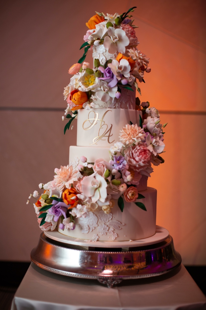 To celebrate getting married at Gotham Hall, Stefanie and Mike sought RBI Cakes to design a lavish masterpiece that featured vibrant sugar blooms and satin trimming inspired by detailing on the bride’s wedding dress.