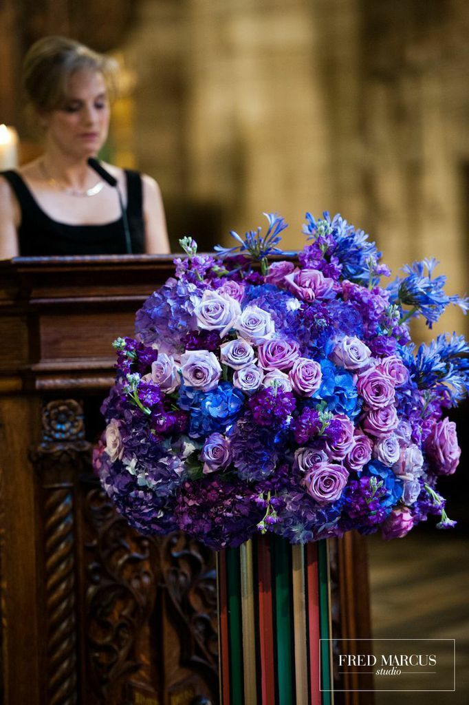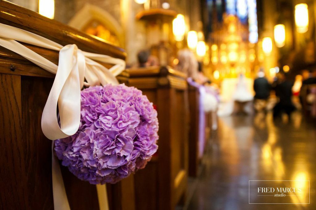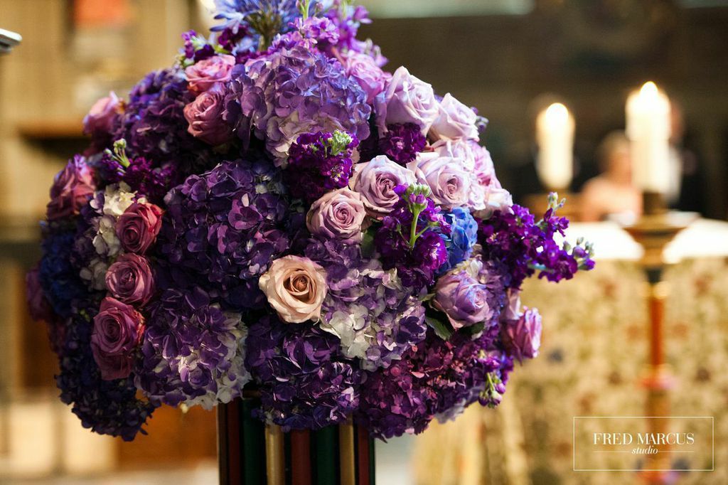 Setting a tone that was both romantic and classic, the bridesmaids wore soft black, which played off of amethyst and lavender-colored rose bouquets. Our bride was stunning in a strapless dress with a sweetheart neckline and full skirting that paired magnificently with her cream-colored vendela rose bouquet. The ceremony flowers at the Church were designed with a wide array of both bright and deep purples, whereas the reception centerpieces featured white orchids and more creamy roses. Furthermore, the Pierre Hotel was decked with the subtle lighting of three-piece candle arrangements of varying heights as a delightful complement to the centerpieces. Together the feel of the affair was an enchanting and graceful symphony of style