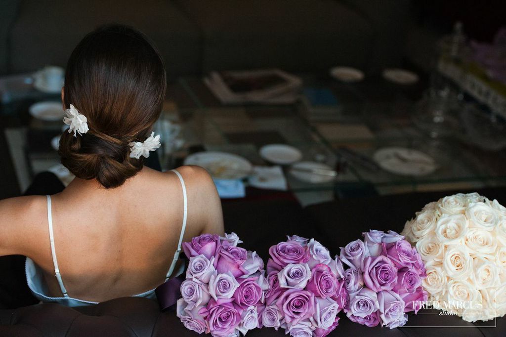 The look and feel of this venue wed beautifully with the classic decor and floral arrangements selected by our couple. Featuring a palette of crisp white, lush purples, and soft cream, our couple’s creation made for a truly dazzling and sophisticated look that was perfect for this high-art-like hotel.