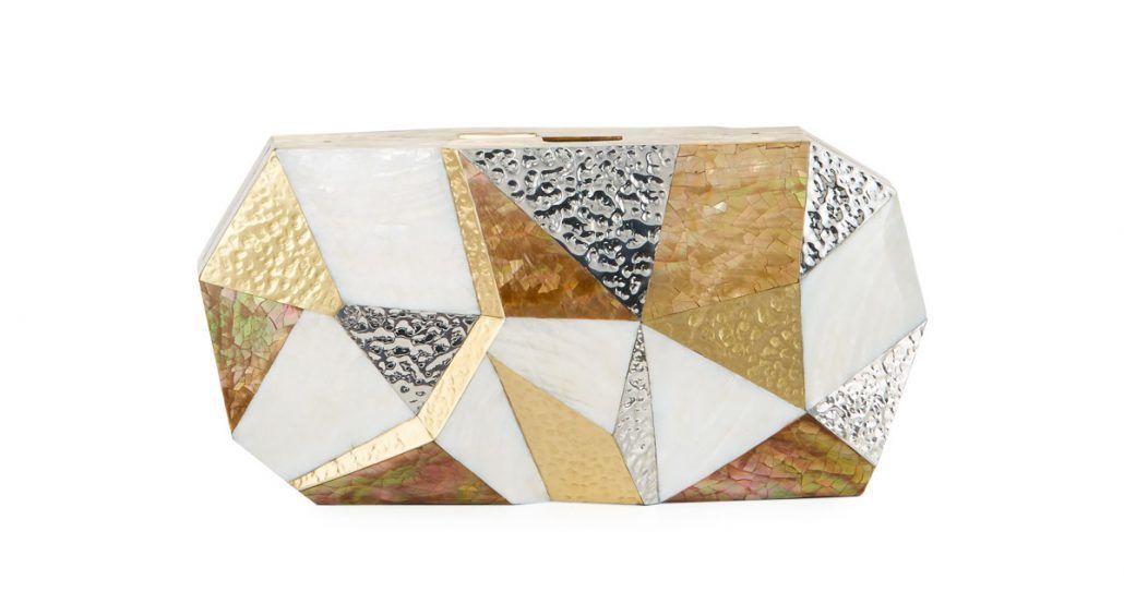 Your style leans toward minimalism with clean and simple lines, but you are using your wedding day to go a little bolder than usual. Check out this faceted geometric box clutch in mother-of-pearl and hammered metal by Rafe. The design’s combination of textures, colors, and pattern is stunning, making this the perfect clutch for the modern bride.