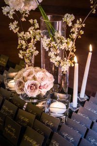 Danielle & Noah Wedding – Card Table – Roses Cherry Blossom Branches – Cold Spring Country Club NY – Photography by Brett Matthews