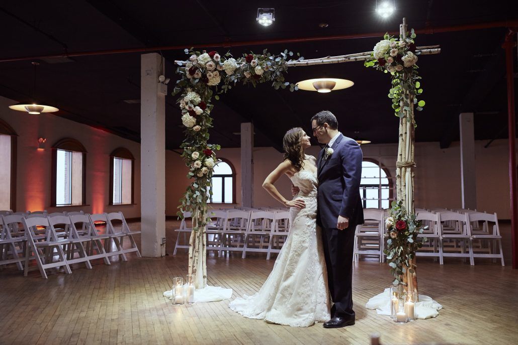 Chuppahs and Wedding Arches: A focal point of the ceremony, chuppahs and wedding arches are a statement made by the couple as they enter their new life together. For outdoor ceremonies at The Liberty Warehouse, these symbolic structures are set up at the promenade’s apex where guests look on as the couple exchanges vows against a picturesque backdrop. A lovely chuppah made of white birch branches adorned with yellow and white blooms and lush greenery expresses nature’s splendor. A floral arch of pink and white roses encapsulates a modern day fairy tale. A small, indoor ceremony showcases a chuppah embellished with a romantic palette of red, pink, and white flowers with greenery accents.