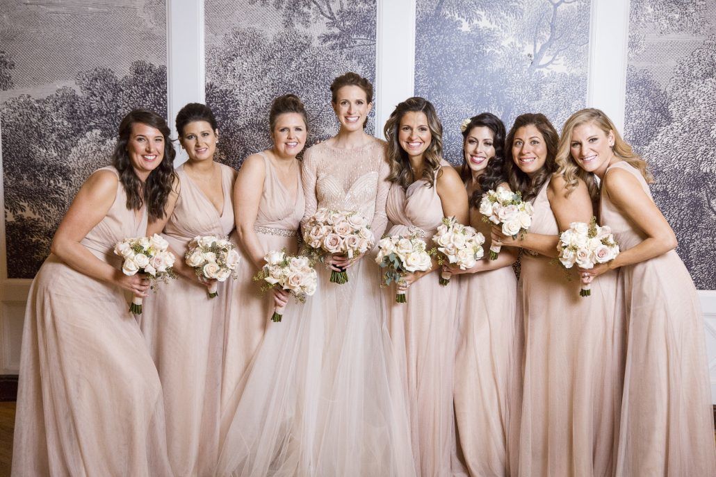 - Lauren & Brett Wedding – Liberty Warehouse Brooklyn – Bridal Party with Blush Bouquets