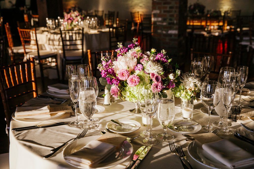 - Jennifer & Paul Wedding – Low Centerpiece – Liberty Warehouse NYC – Photo by Agaton Strom
