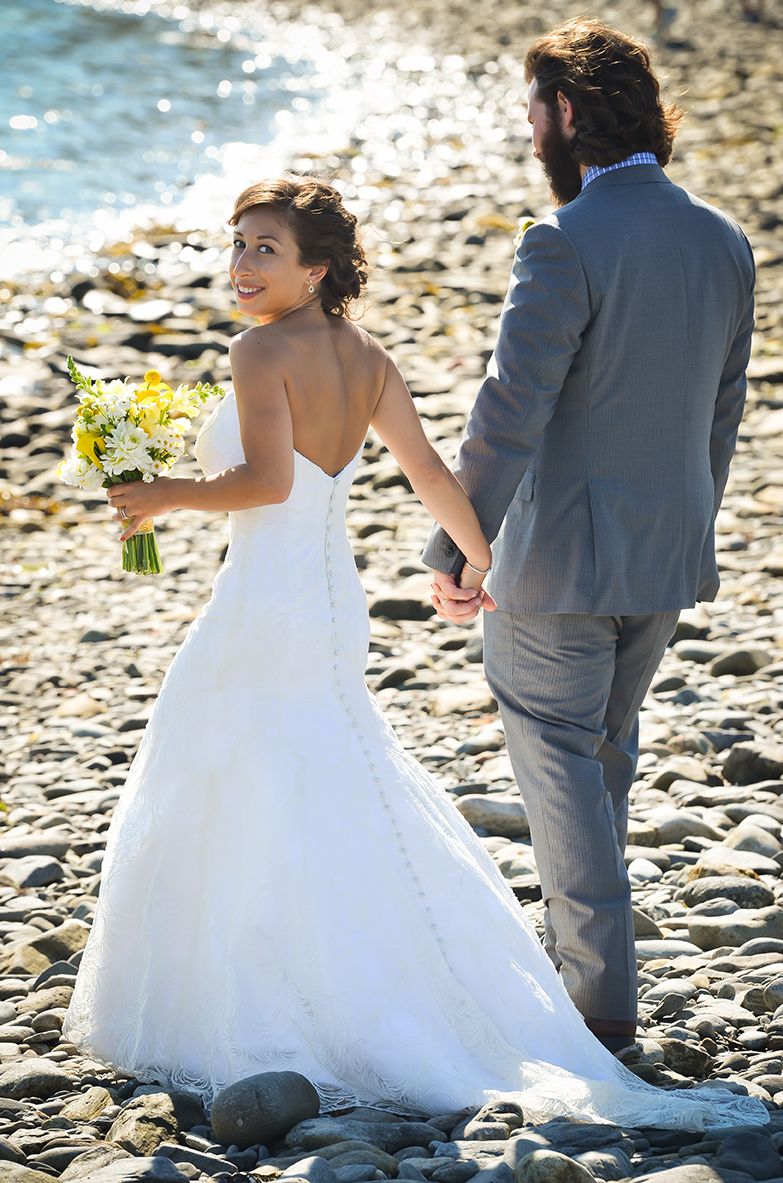 Our wedding was a more rustic/simple wedding on an island off the coast of Maine (July 21, 2012). We met in Maine, and lived there for about 5-6 years, so it was really meaningful for us — it was all about the views of Casco Bay as the backdrop for our ceremony and reception. We got really lucky had perfect Maine weather, not too hot and not storming, just blue skies and a salty sea breeze. We did not have a wedding party – just our immediate families (moms, dads, sisters) at the altar with us. It was really intimate and felt right. We wrote our vows together since we wanted them to be relevant to us.