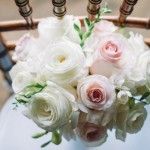 Bridesmaids’ bouquets were composed of blush and cream roses with white freesia. Table centerpieces were classic and romantic, in the same delicate, feminine color palette of blush, white, cream and pale green. Low centerpieces featured exquisite phalaenopsis orchids. We added drama to the high centerpieces with cascading dendrobium orchids and amaranthus.