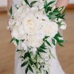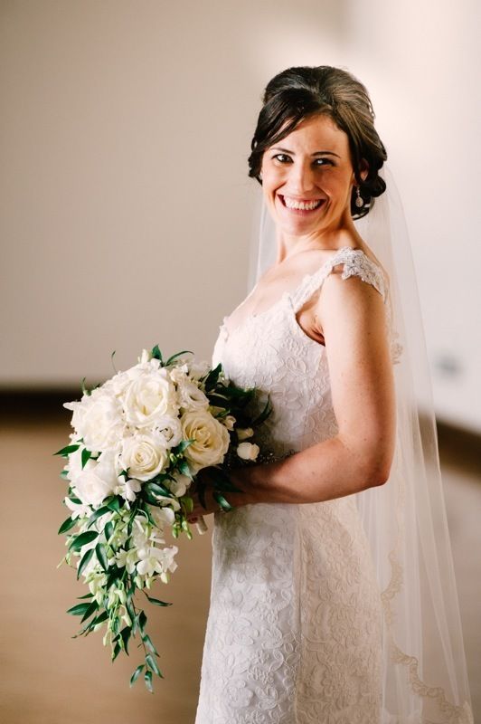 For an organic, cascading bridal bouquet in classic white and cream, we used standard roses, garden roses and spray roses, dendrobium orchids, lisianthus and stephanotis.