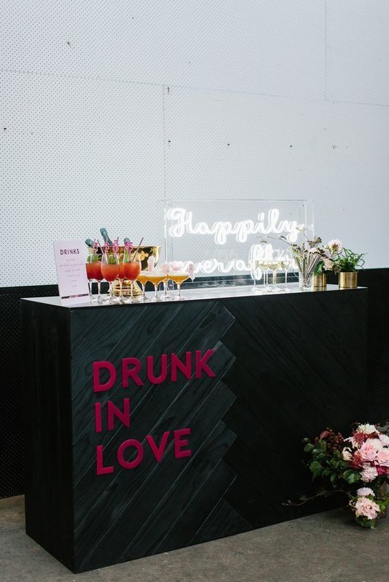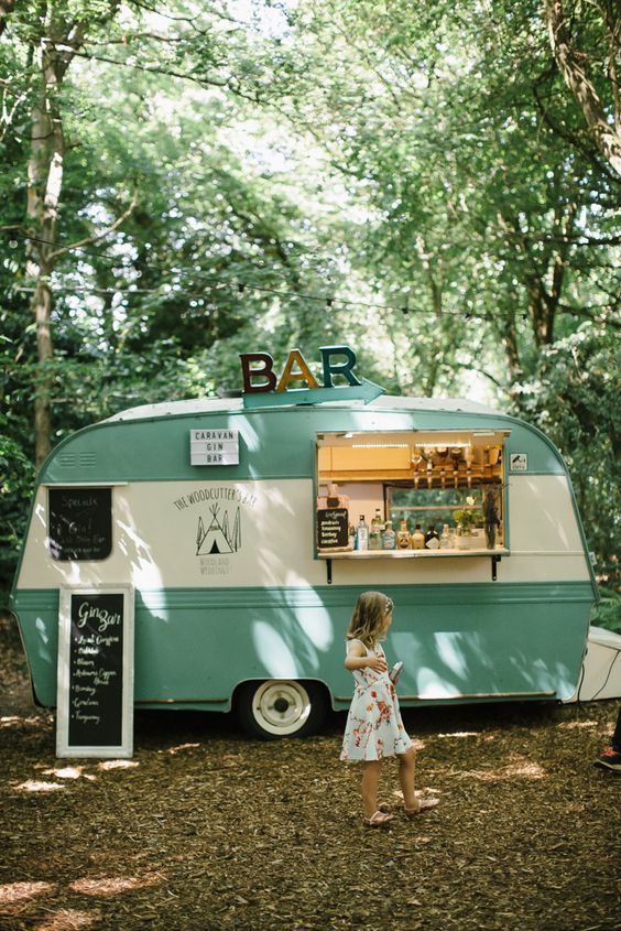 Whether you’re serving iced tea and lemonade or artisanal cocktails, make sure your drink station is stylish, easy to find, and has a welcoming effect on your guests. Of course we love the idea of decorating the bar with a voluminous arrangement of vibrant florals! The typical reception bar gets a chic makeover with neon signage and “Drunk In Love” spelled out bold lettering. Make your fairytale garden wedding dreams come true by serving champagne on a suspended mirror. Everyone will remember how fun it was being served drinks from the window of a retro camper!
