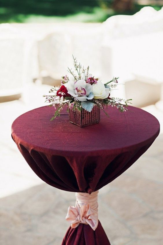 Make cocktail tables stand out with a stunning linen and floral centerpiece combo. For a dramatic table top, tie rich burgundy fabric with a blush satin bow and top with a lovely white and wine colored arrangement set in a shimmering vase. After setting up a light under the tables, cover the tops with scallop-textured linens and submerged greenery centerpieces to create an ambiance of natural enchantment. Luxe linens paired with soft colored blooms in mirror vases radiate romantic elegance.