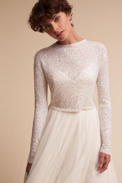 Take the chill out of winter by covering up a sweetheart bodice gown with a dazzling hand-stitched sequin sweater. Paring wonderfully with a full tulle skirt, the piece will transition your attire from ceremony to reception with ease. Added bonus – you get two bridal looks for a fraction of the cost.