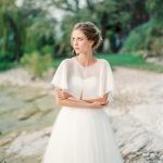 It may not look like much, but a bridal capelet offers just enough coverage to make wearing a strapless gown much more bearable on a frosty day. A crystal adorned design is so dazzling you won’t even have to bother with jewelry. A silk chiffon cover up channels a delicate and feminine mood.