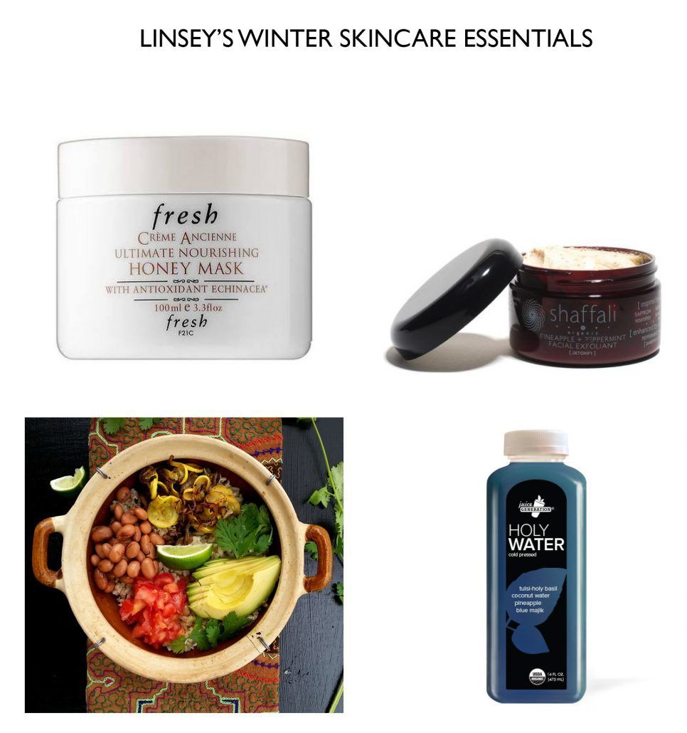 There are so many amazing products out there right now. I love Supergoop’s preventative products, which should be slathered on (even in the winter!) and I am a die hard Fresh fan. I love that the Fresh products are all natural and each product actually does exactly what it sets out to do. I basically own all of their products, but I love using the honey mask a few times a week in the winter. It feels like a nice, warm, cup of tea for your face! I also think that all of the products found at Heyday in NYC are amazing. My absolute favorite exfoliator of all time is Shaffali’s Pineapple + Peppermint Exfoliator. It is essential to exfoliate the skin and then put a deep moisturizer on to ensure that it penetrates and really soaks in.