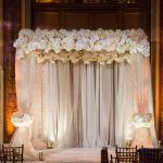 The ceremony was enchanting. With a romantic aisle lined in pillar candles and rose petals and an white chuppah made of hydrangea, stock, Phalaenopsis and dendrobium orchids, cream vendela roses and white tea roses, the scale and size of the chuppah perfectly matched the grandeur of the ballroom. Beautifully draped in chiffon and lace, the chuppah was romantic, classic, and perfect for this luxurious wedding venue.