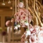 Their Russian heritage was honored with vodka and caviar awaiting guests when they sat down at their tables! Marianna chose ornate high centerpieces featuring 360 roses white, blush and lavender roses arranged with an ombre effect to signify a full circle, like their wedding rings. Suspended from these lush rose arrangements were romantic and whimsical bubble terrarium tea lights and crystal beaded votive holders. A bed of champagne roses covered the base of the centerpieces, creating texture, height and dimension across the room. The sweetheart table where the bride and groom sat featured a beautiful, low and lush arrangement of hydrangea, Phalaenopsis and dendrobium orchids, blush Keira garden roses and amnesia and quicksand roses in shades of lavender and taupe. There wasn’t a dry eye in the house when Jason’s brother Esmond, a singer-songwriter, performed his wedding speech for his dear brother and his bride!